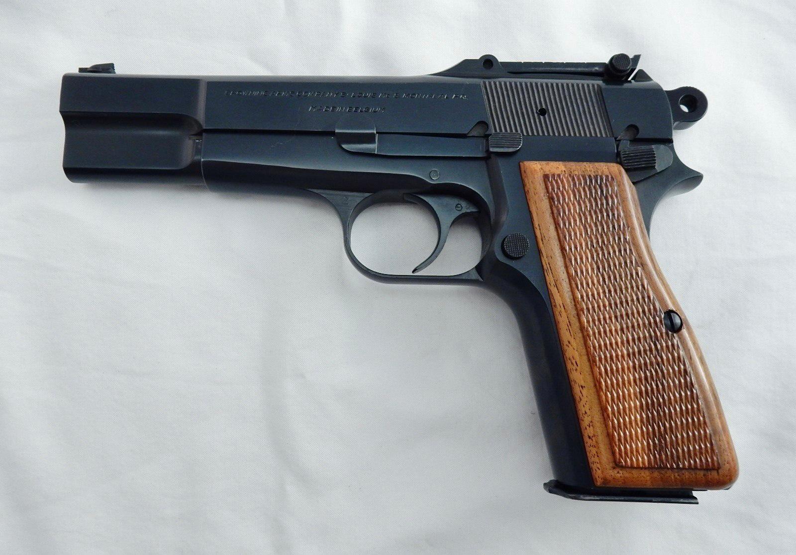 1967 Browning Hi Power Tangent Ring Hammer T SERIES guns dealers. This is a Browning hi power 9mm. This gun is 99%+ with original red lined pouch in online gun store with the gold colored zipper .