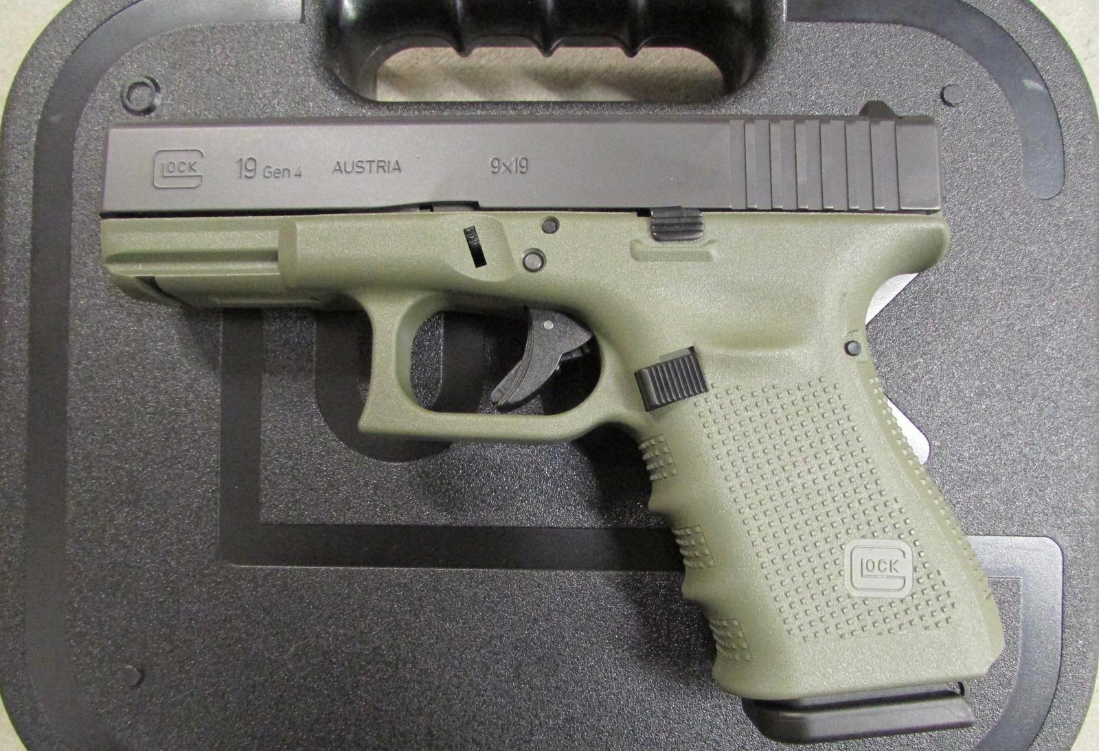 GLOCK 19 GEN 4 9MM GREEN w/ Black Slide. Comes with 3 – 15 Rd. Magazines. The Modular Back Strap design lets you instantly customize its grip to adapt to an individual shooter’s hand size. The surface of the frame employs the new scientifically designed, real-world-tested, Gen4 rough textured technology. Internally, the new GLOCK dual recoil spring assembly substantially increases the life of the system. A reversible enlarged magazine catch, changeable in seconds, accommodates left or right-handed operators. The G19 Gen4 9x19mm retains the GLOCK accessory rail for your attachments.