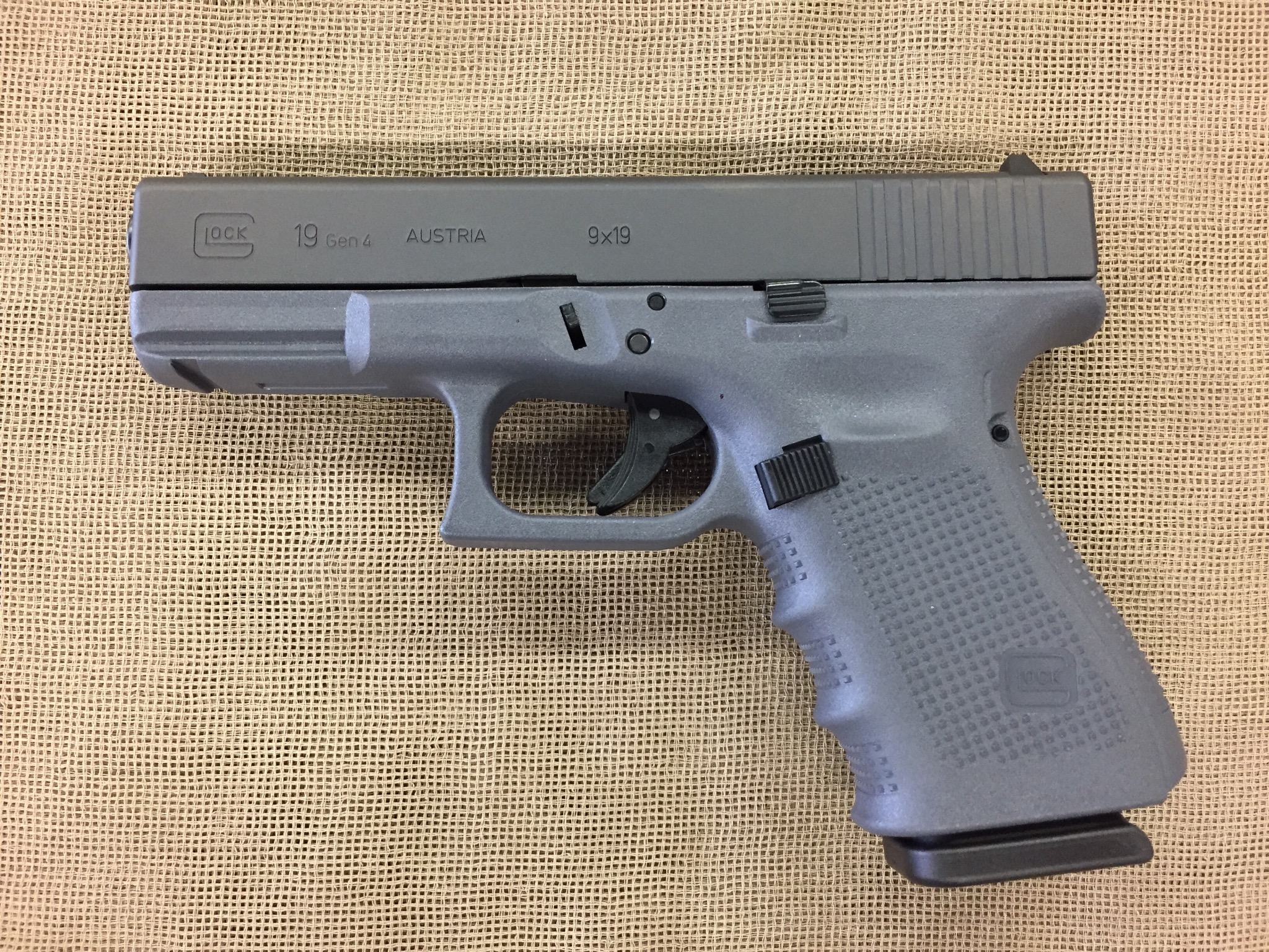 New GLOCK MODEL 19 GEN 4 9MM 15+1 capacity, 3 magazines, 4″ barrel, accessory rail, dual recoil spring system, Gray cerakote frame with accessory rail and interchangeable backstraps,