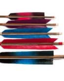 Bamboo shafts. Dyed primary turkey feathers, solid colour and multicolour or not dyed white, length 6″ with Kyudo style shape. Kyudo style angle of feathers (leading feather parallel to the slot).