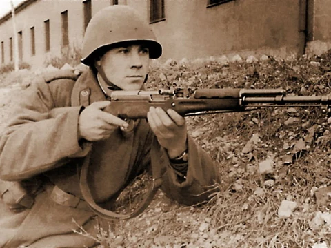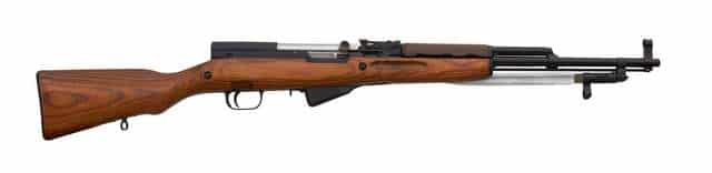 The Soviet SKS Semi-Auto 7.62×39 Rifle has a conventional carbine layout, with a wooden stock and no pistol grip. A gas-operated weapon with spring-loaded operating rod and a gas piston rod that work the action via gas pressure pushing against them.
